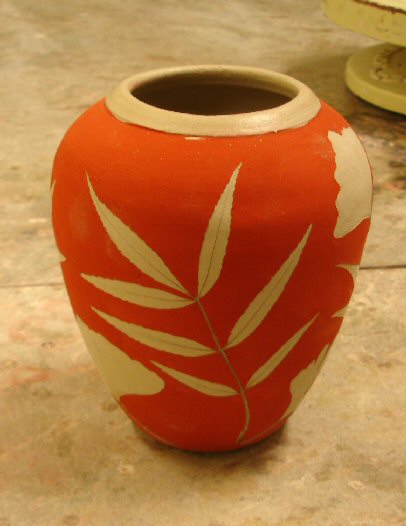 thrown and trimmed, it was coated with a layer of underglaze (the darker